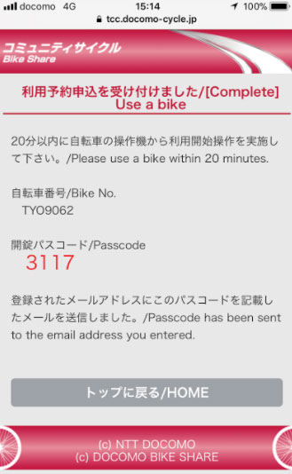 スマホでコミュニティーサイクルのサイトの「ログイン」し、借りるサイクルポートを選択すると、借りられる自転車の番号が一覧で表示され、気に入ったものを選択すると、下の画像のような4桁のパスコードが表示されます。