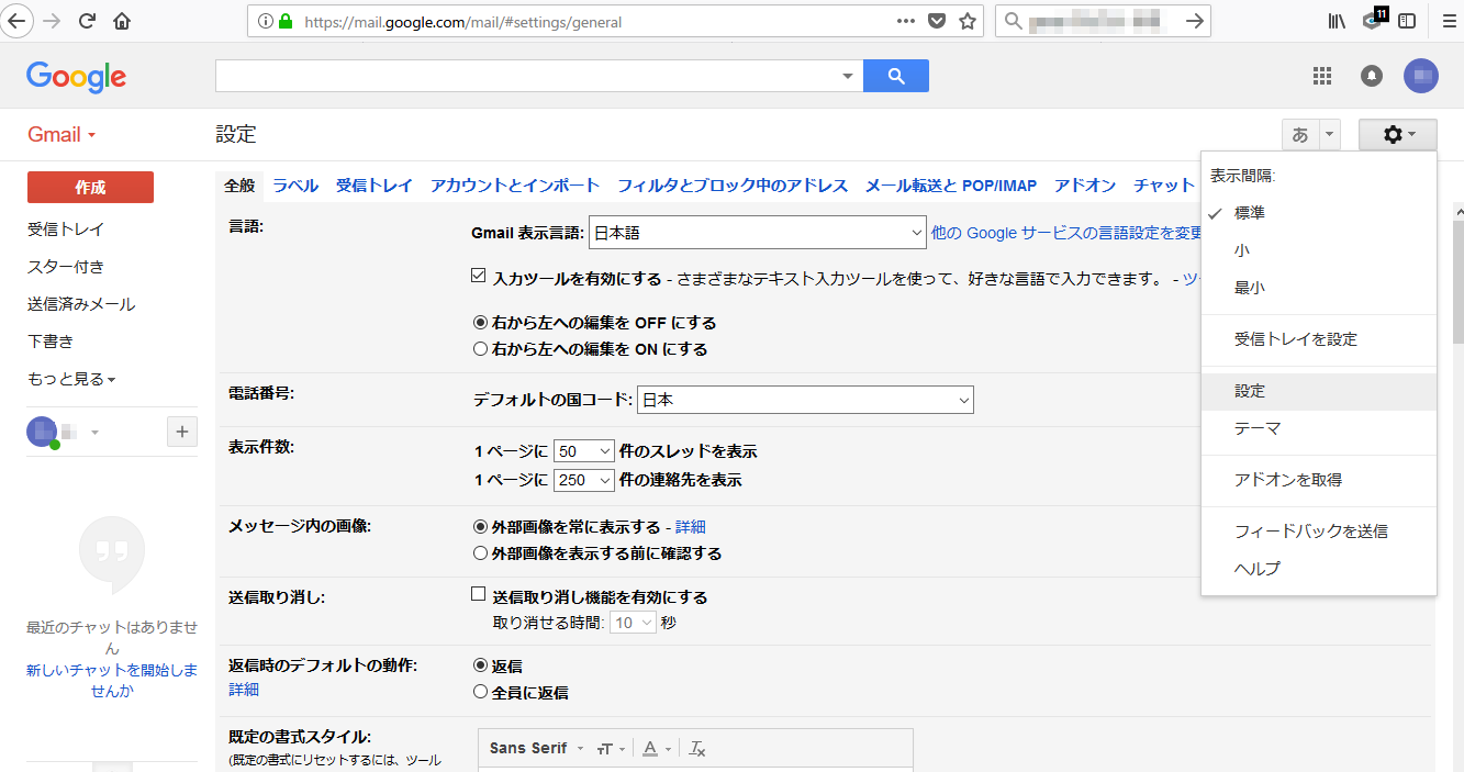 Gmailのサイトにログインし、右上の歯車のようなマークをクリックし、「設定」を選択します。