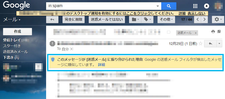 Gmailの迷惑メールフォルダに振り分けられたメールには、「このメールが [迷惑メール] に振り分けられた理由」というものが表示されます。