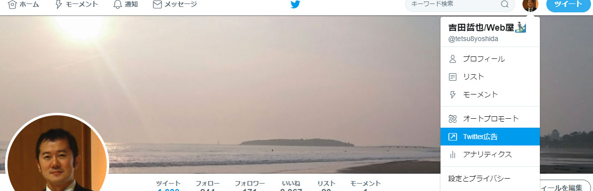 まず、利用しているツイッターアカウントでログインし、右上のプロフィールのアイコンをクリックし、「Twitter広告」をクリックします。