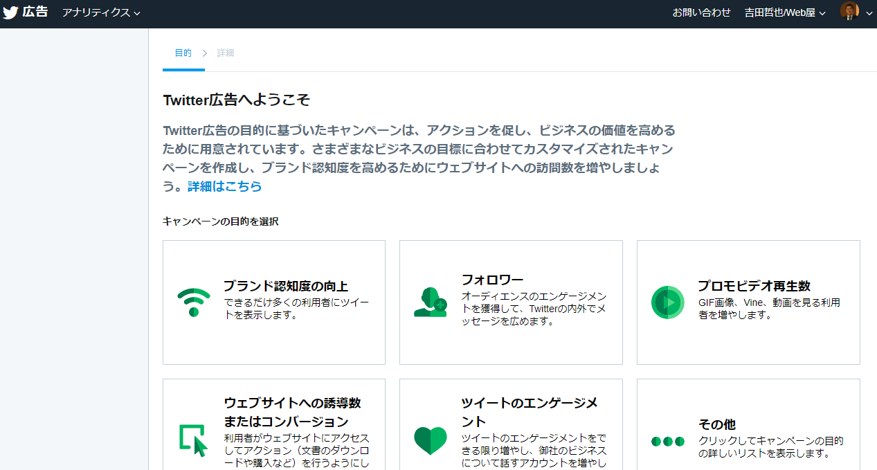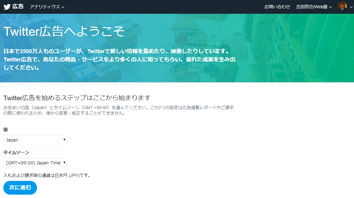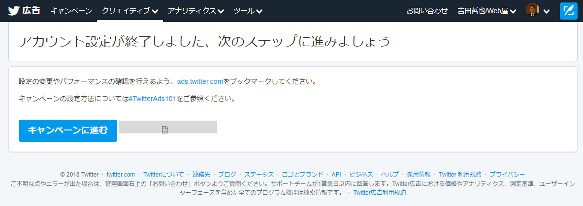 以下のような「Twitter広告にようこそ」という画面が表示されます。