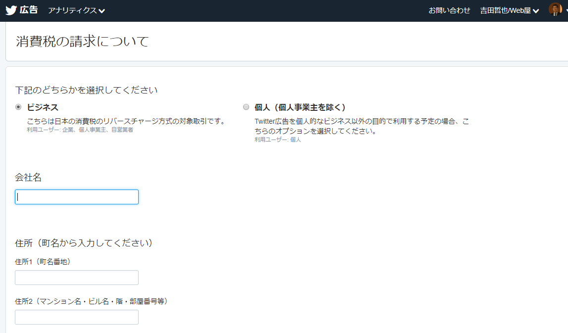 消費税の申告についてと言う画面が出るので、ビジネスか個人事業主か選択し、詳細情報を入力します。