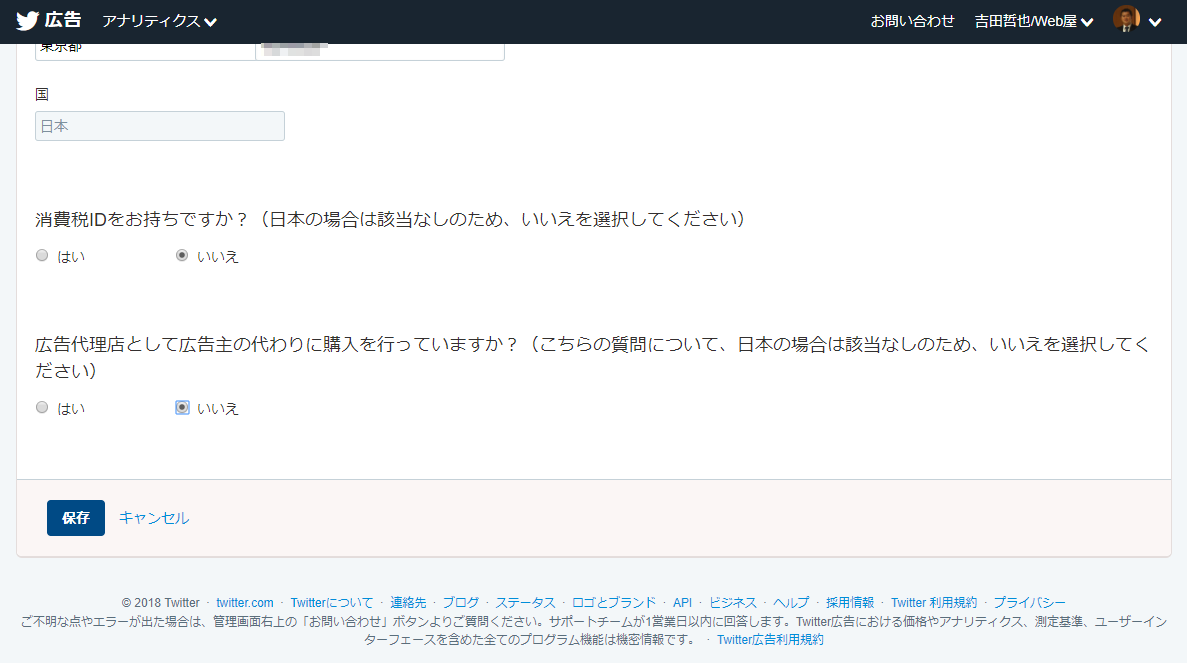 住所などを入力し、消費税IDをいいえ、広告代理店の箇所もいいえを選択し保存します。