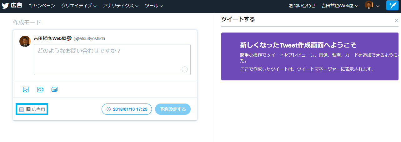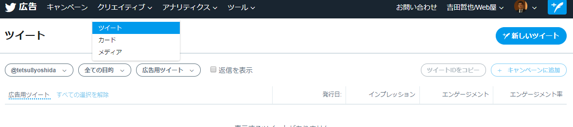 上部のメニューのクリエイティブからツイートを選択し、クリックします。