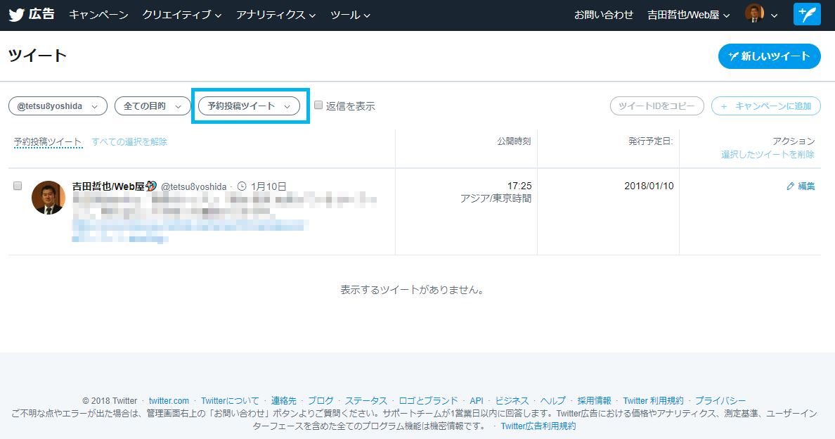予約したツイートは、クリエイティブ>ツイートを開き、「ツイート」の下のプルダウンメニューから「予約投稿ツイート」を選択すると表示されます。